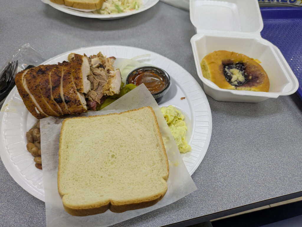 Gene went overboard on decorations and food. The latter came from Kinder’ BBQ with even more food from somewhere else. There was a tower of delicious cupcakes plus cookies. I brought along Circus Peanuts, an old fashioned candy that was my mom’s favorite.